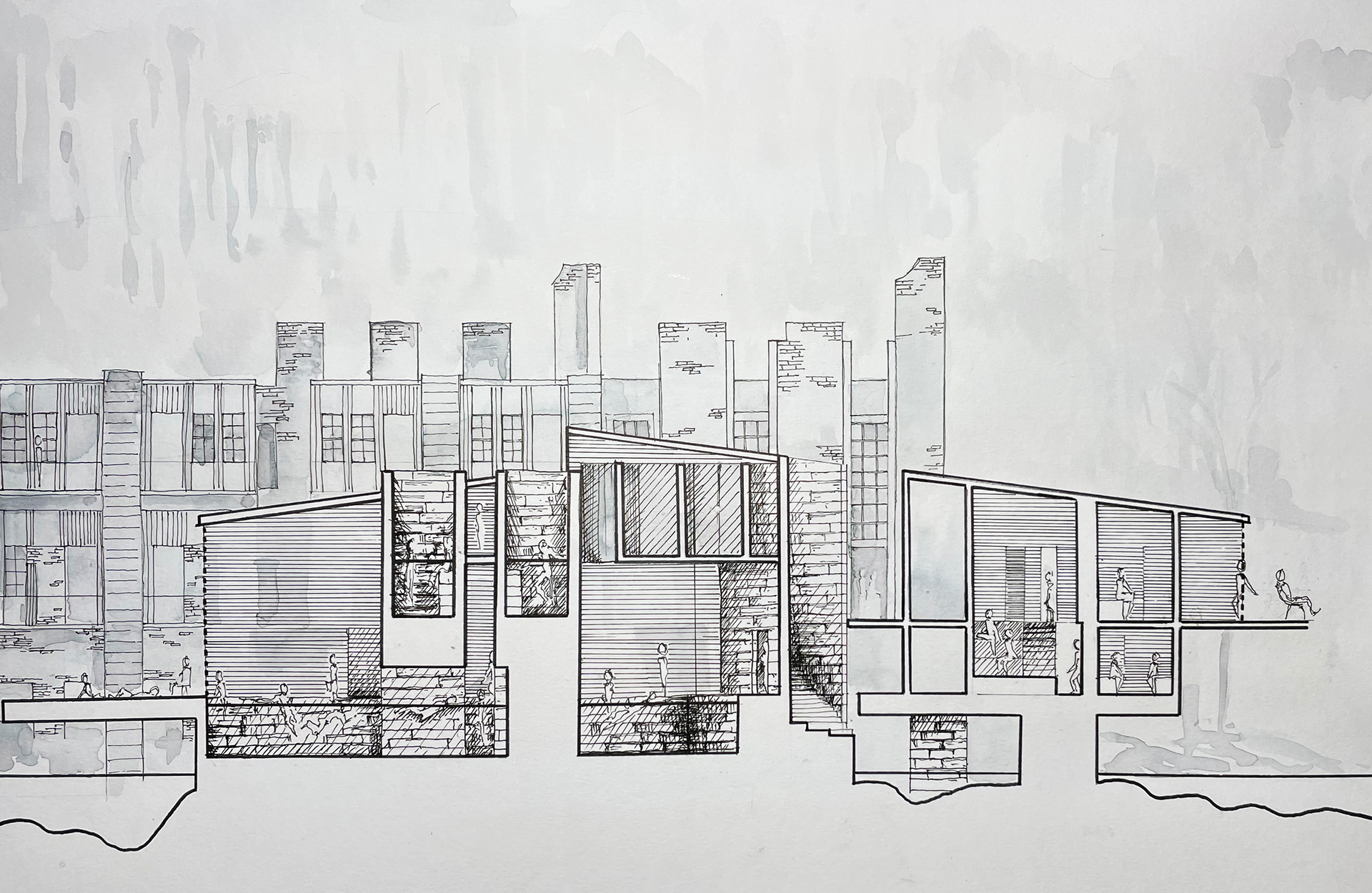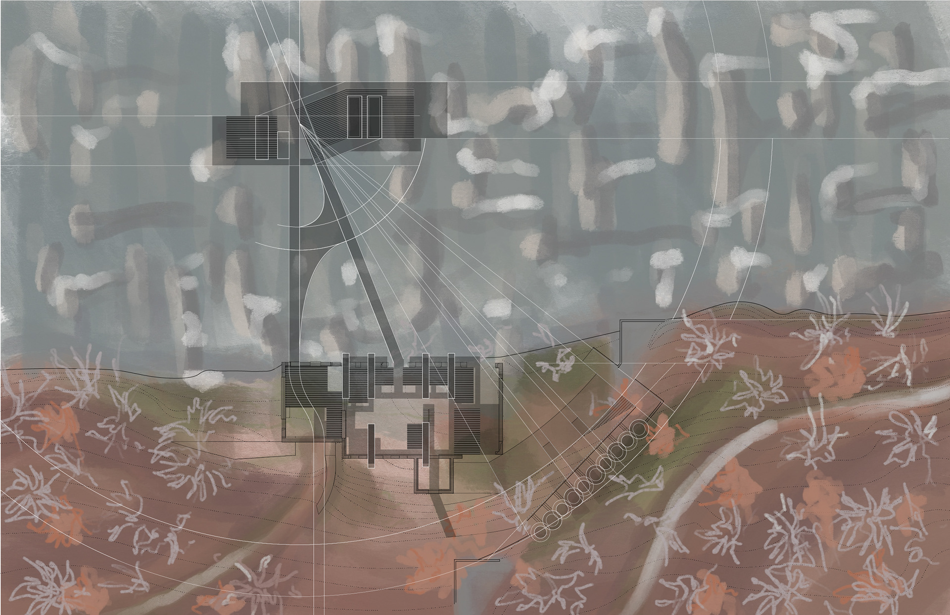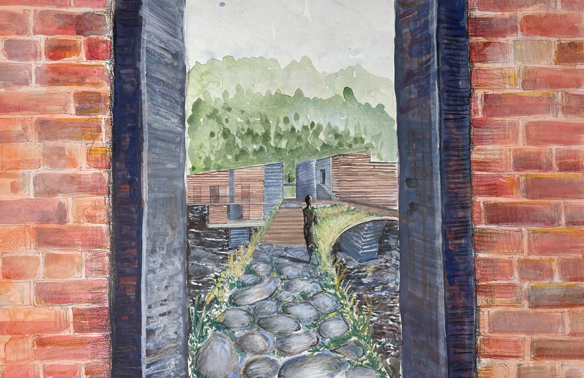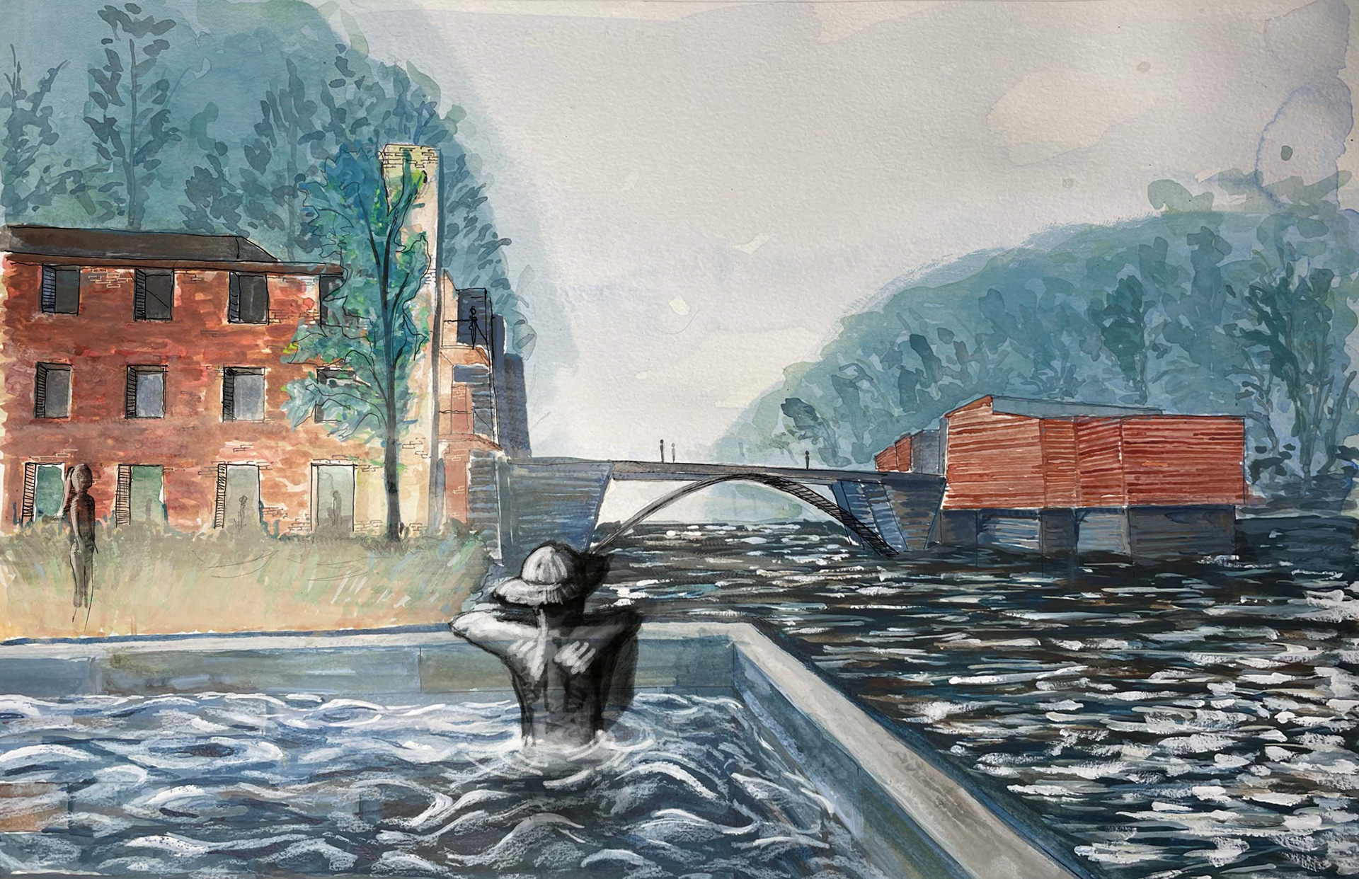 The following is a theoretical design for a Wellness Retreat located in Sweetwater Creek State park, thirty minutes outside of Atlanta. The site is on a river and within and around the ruins of the New Manchester Manufacturing Co. mill. The retreat will act as a refuge and contrast the urban life that many of the users will be accustomed to. Visitors of the state park and retreat have the ability to wander for miles on a network of trails in the park. Movement along a forest path is a dérive, a French word describing when a person or persons “let themselves be drawn by the attractions of the terrain and the encounters they find there.” - Guy Debord, Theory of Dérive. The trail is blazed in a process similar to a dérive, as the path must react to the landscape and molds to the valleys and mountain peaks. Dérive is a design that reacts to the landscape and elements in ways that blur boundaries between mind and nature. The desired feeling for the user is one of a long hike. Where the hiker relaxes into the terrain, so that their movement is defined by it, and in the process brings the life of the natural landscape into their body and mind.