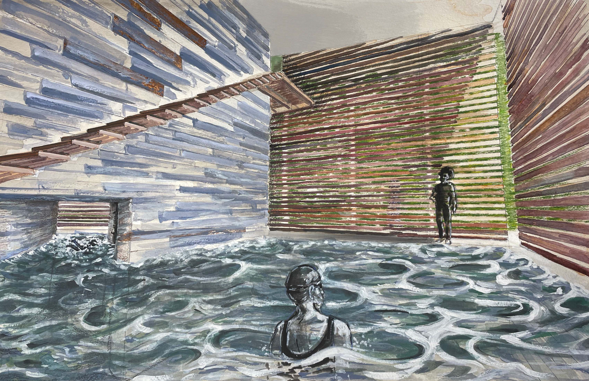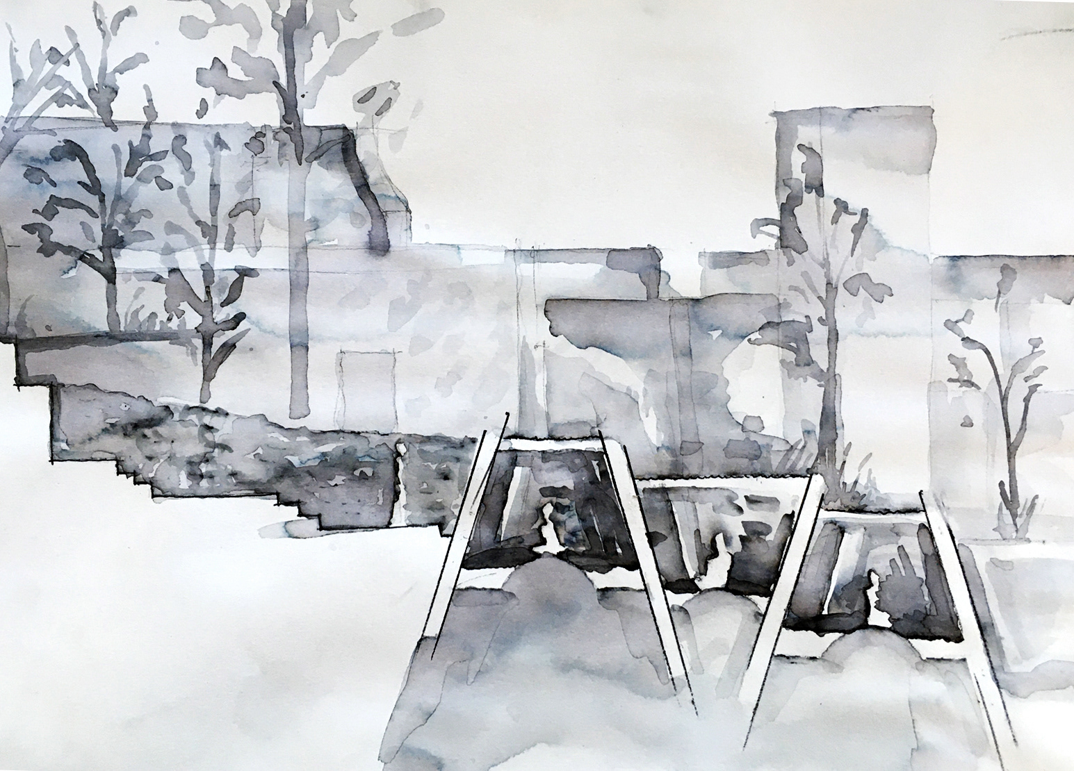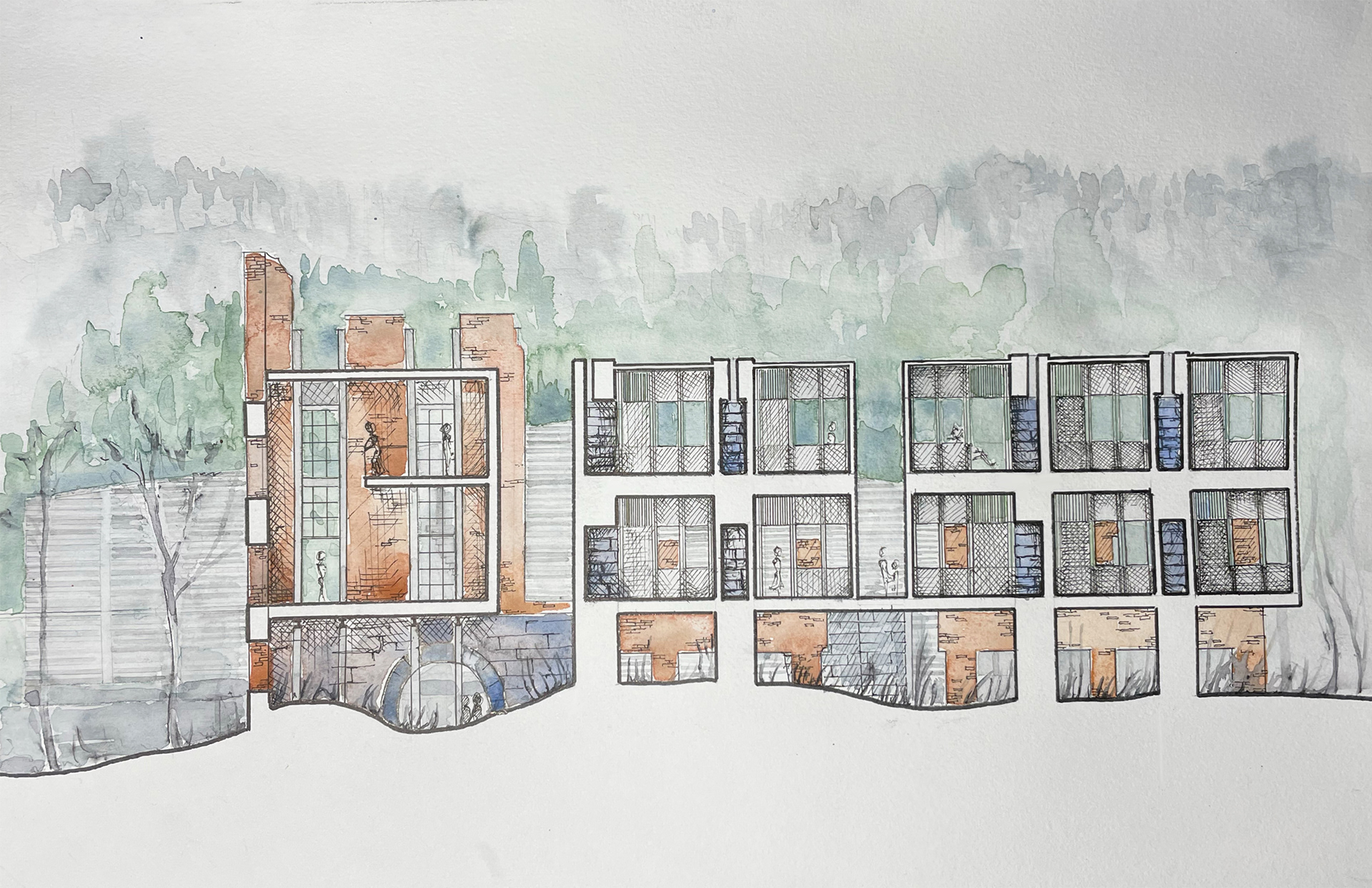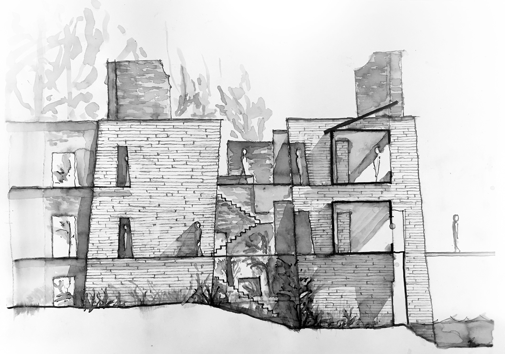 The following is a theoretical design for a Wellness Retreat located in Sweetwater Creek State park, thirty minutes outside of Atlanta. The site is on a river and within and around the ruins of the New Manchester Manufacturing Co. mill. The retreat will act as a refuge and contrast the urban life that many of the users will be accustomed to. Visitors of the state park and retreat have the ability to wander for miles on a network of trails in the park. Movement along a forest path is a dérive, a French word describing when a person or persons “let themselves be drawn by the attractions of the terrain and the encounters they find there.” - Guy Debord, Theory of Dérive. The trail is blazed in a process similar to a dérive, as the path must react to the landscape and molds to the valleys and mountain peaks. Dérive is a design that reacts to the landscape and elements in ways that blur boundaries between mind and nature. The desired feeling for the user is one of a long hike. Where the hiker relaxes into the terrain, so that their movement is defined by it, and in the process brings the life of the natural landscape into their body and mind.
