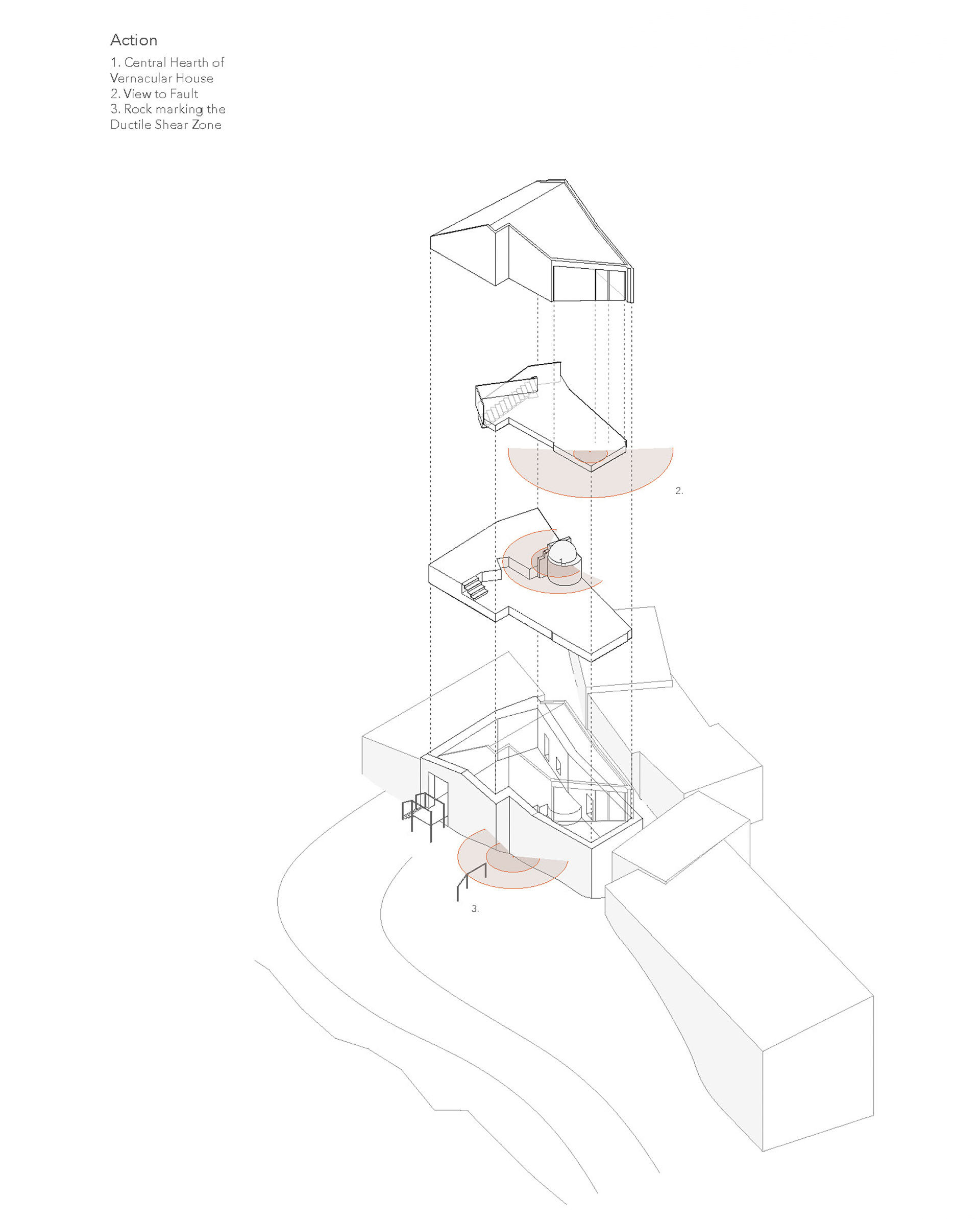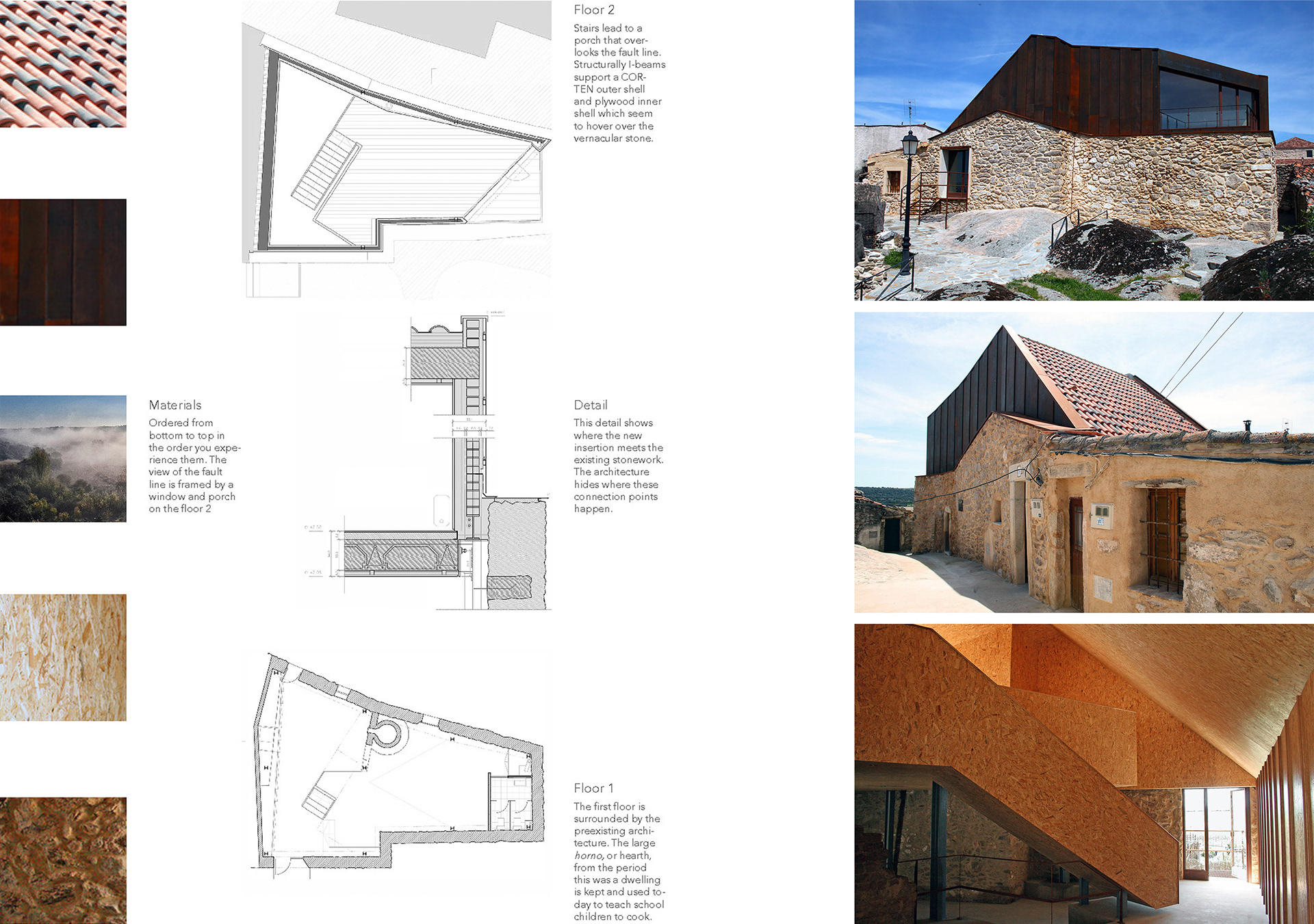 The following is a study of “Geological Interpretation Hall” a project designed by Rube Nieto Diego. This museum is a modification to a vernacular house in Juzbado. The Spanish town is built from granite containing the rock structure mylonite, key in determining the towns location along a ductile shear zone: a relic of a tectonic event from millions of years ago, and the museums focus. The architecture carefully considers material to highlight this history.
