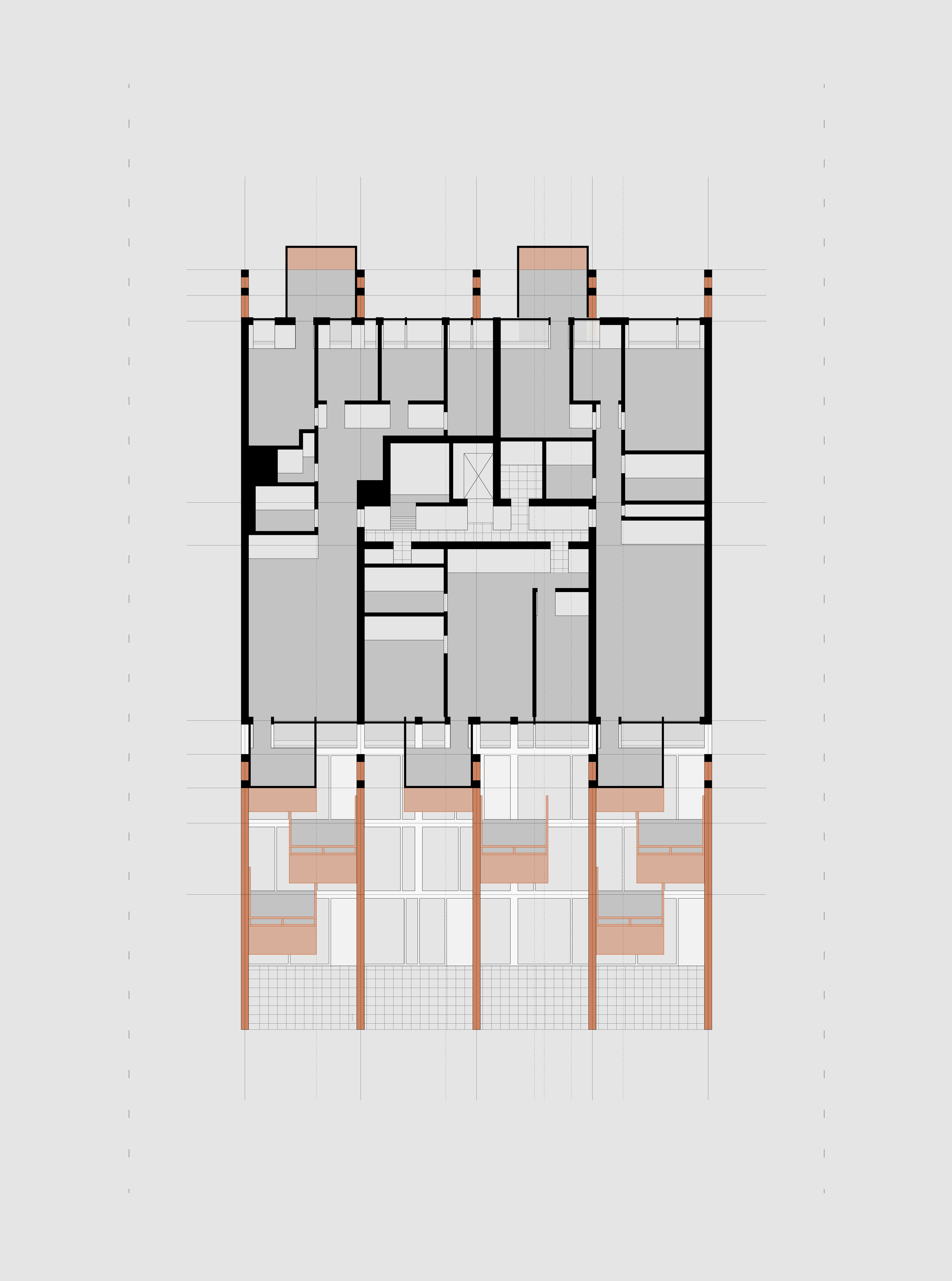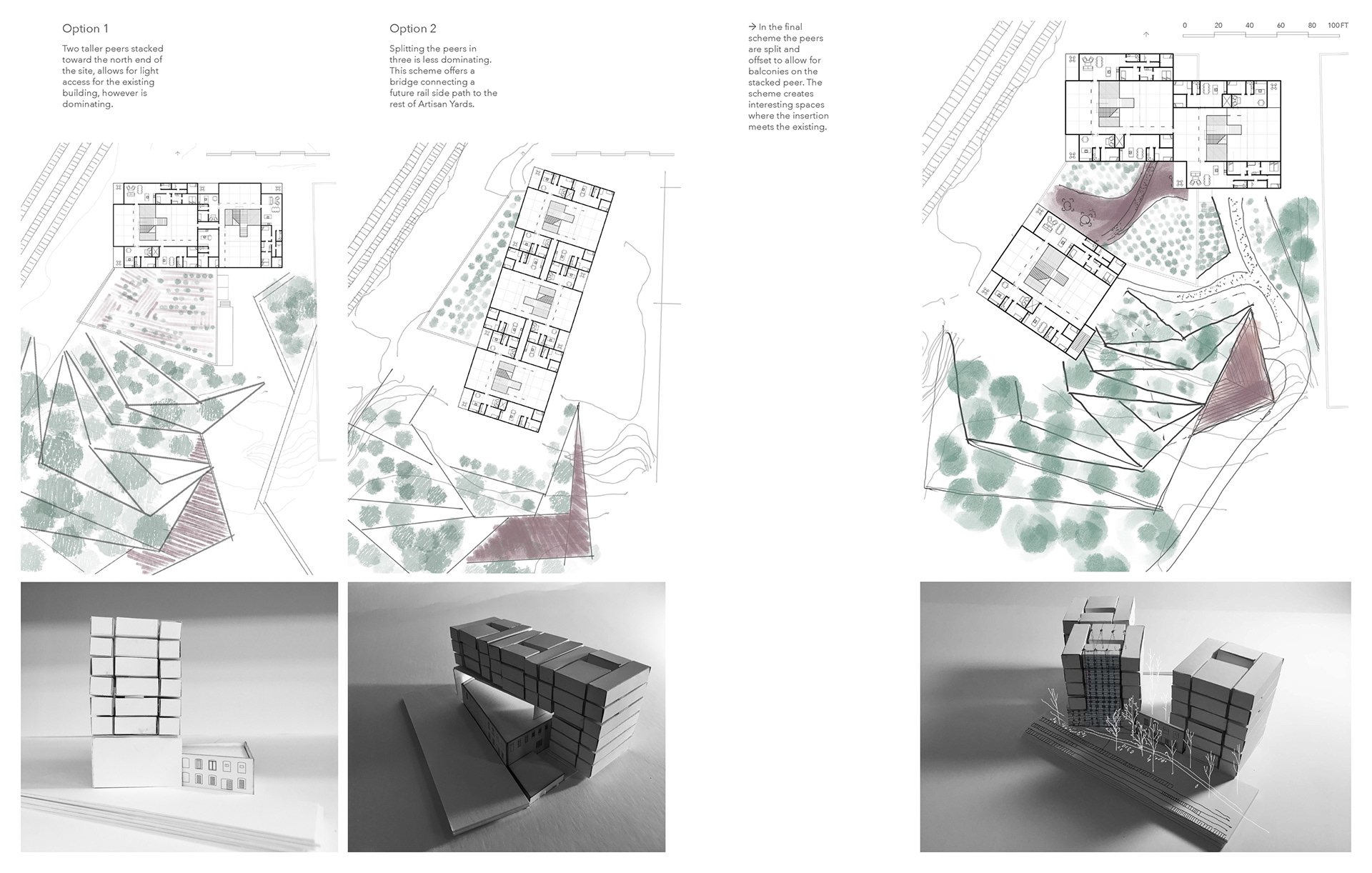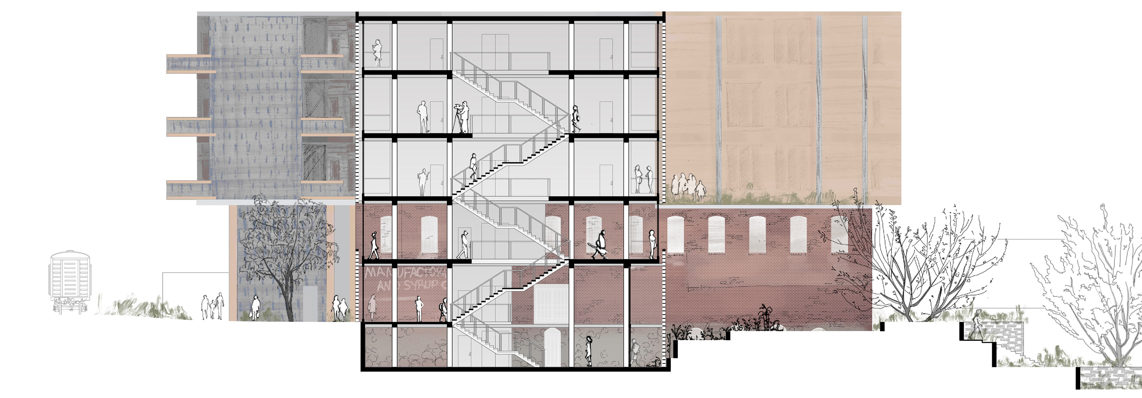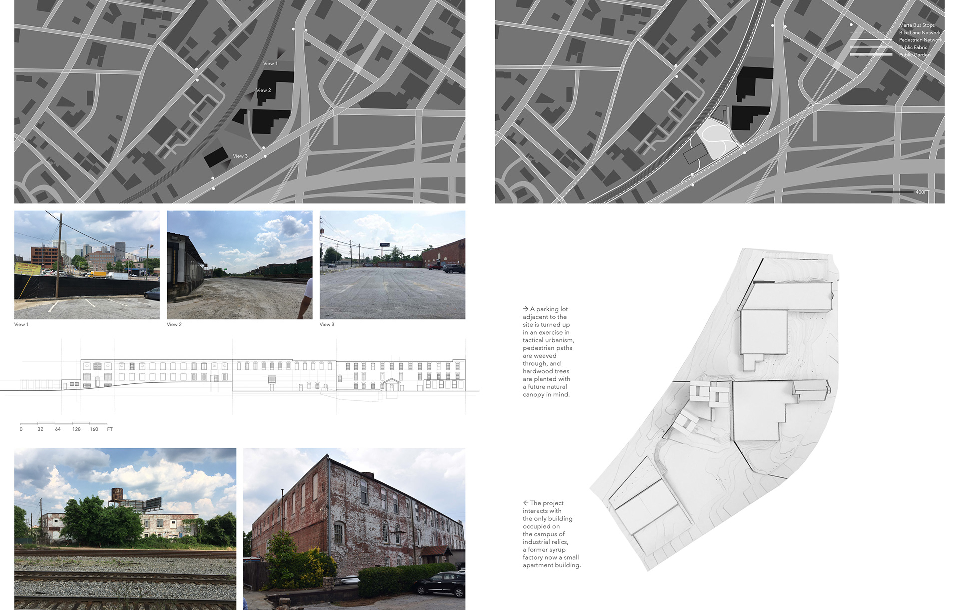Slow Regeneration is study in modular design responding to a formally industrial landscape called Artisan Yards in Mechanicsville, Atlanta. The project interacts with the only building occupied on the campus of industrial relics, a former syrup factory now a small apartment building. The immediate site is planted to slowly regenerate the soil as plants relieve toxins from the ground. Terraces are later built up to support a small urban farm which is given to the community as an educational platform. The built insertion begins at the terrace level with a farmers’ market, where food from the on-site farm and other urban farms in the city are sold. Above grade are 3 stories of residencies and studio spaces. The residencies can accommodate small families, roommates, couples and singles. The studio spaces are designed for collaborating artisans.